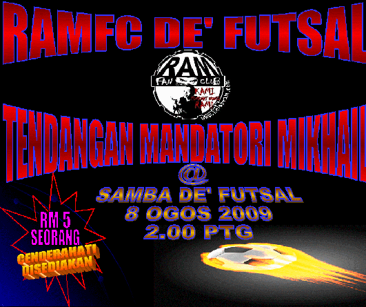 Jangan ketinggalan aktiviti RAMFC pada 8 Ogos 2009, futsal bersama RAM. Maklumat lanjut akan dihebahkan kelak.